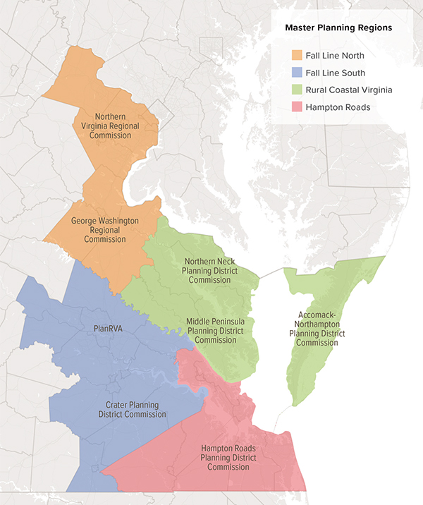 Khung này chia vùng ven biển Virginia thành bốn vùng quy hoạch tổng thể. Kế hoạch tổng thể sẽ xác định các dự án ưu tiên trong mỗi bốn khu vực nằm trong ranh giới của tám Ủy ban quy hoạch vùng ven biển và Ủy ban khu vực (PDC/RC).