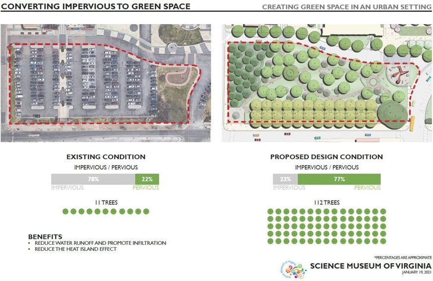 | The Green tại Bảo tàng Khoa học Virginia (Vòng21 FY 2) (đã rút lui) | Không gian mở và công viên | Năm tài chính21 Vòng 2 | 5.20 | Thành phố Richmond | Quỹ Virginia Outdoors | Tiểu bang | Quỹ Virginia Outdoors | 37.560893 | -77.466498 | Quỹ Virginia Outdoors và Bảo tàng Khoa học Virginia ở Richmond đã đề xuất một quan hệ đối tác sáng tạo cho phép Bảo tàng chuyển đổi bãi đậu xe trên mặt đất tại Ga Broad Street lịch sử thành một công viên đô thị. Diện tích 5.2mẫu Anh được đề xuất sẽ được bảo vệ vĩnh viễn như một không gian mở mang lại lợi ích về giải trí và môi trường. Dự án sẽ kết hợp và chứng minh các giải pháp tự nhiên dựa trên khoa học để giải quyết tác động của biến đổi khí hậu, đồng thời giải quyết nhu cầu ngày càng tăng về không gian xanh mở trong một khu vực đang chịu áp lực phát triển mạnh mẽ. Việc chuyển giao quyền kiểm soát lô đất cho VOF theo Đạo luật Đất không gian mở sẽ bảo vệ lô đất này vĩnh viễn khỏi mối đe dọa phát triển trong tương lai và sẽ cung cấp nguồn vốn cần thiết để chuyển đổi lô đất này thành công viên công cộng chất lượng cao và cảnh quan bền vững. Dự án này đã bị thu hồi. |