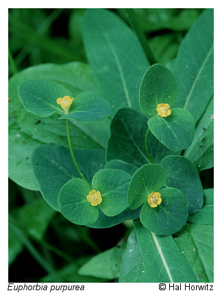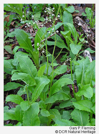 The Central Appalachian Basic Seepage Swamp occurs at elevations up to 975 m (3,200 ft) in areas underlain by metabasalt (greenstone) and other mafic rocks, base-rich granitic rocks, calcareous shale, and limestone. The type is most common on the northern Blue Ridge but is found occasionally in the Ridge and Valley province, and rarely in the western Piedmont. Soils range from strongly acidic to circumneutral, with moderately high calcium and magnesium levels. Overstory composition is mixed, with variable combinations of red maple (Acer rubrum), white ash (Fraxinus americana), black ash (Fraxinus nigra), tulip-tree (Liriodendron tulipifera), and sweet birch (Betula lenta var. lenta). Yellow birch (Betula alleghaniensis) is an important tree at some sites. Spicebush (Lindera benzoin var. benzoin) is usually the most abundant shrub. Herbaceous cover is typically lush, and often features patch-dominance of skunk cabbage (Symplocarpus foetidus), American false-hellebore (Veratrum viride), and/or sedges (especially Carex bromoides ssp. bromoides and Carex prasina). Additional characteristic herbs include marsh marigold (Caltha palustris var. palustris), golden saxifrage (Chrysosplenium americanum), swamp saxifrage (Micranthes pensylvanica), lettuce saxifrage (Micranthes micranthidifolia), marsh blue violet (Viola cucullata), golden ragwort (Packera aurea), orange jewelweed (Impatiens capensis), water-hemlock (Cicuta maculata var. maculata), large purple fringed orchid (Platanthera grandiflora), and various ferns. Most Virginia populations of the globally rare plants bog bluegrass (Poa paludigena) and glade spurge (Euphorbia purpurea), as well as of the globally rare Blue Ridge Mountain amphipod (Stygobromus spinosus), are associated with these basic-soil swamps.