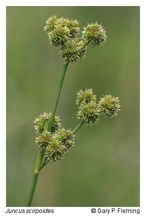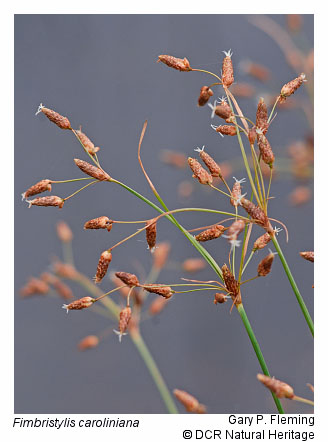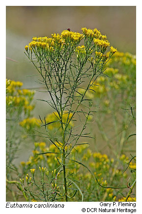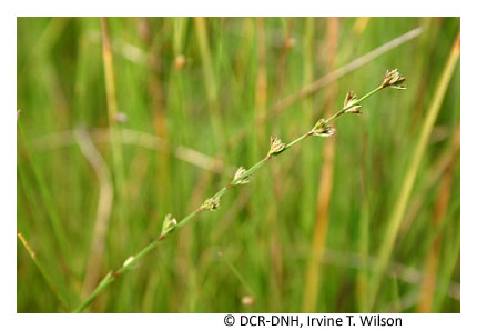 Swales and low dune hollows that have perched water tables and shallow, seasonal or temporary flooding support maritime wet grasslands or shrublands. The swales are predominantly influenced by fresh water from rainstorms, but some may be periodically flooded by salt water from ocean storm surges. A thin, organically enriched, surficial soil layer often contributes to moisture retention. Hydrologic regime and distance from salt spray appear to exert considerable influence on floristic composition. Typically, occurrences are densely vegetated by one or more species of grasses (e.g., saltmeadow cordgrass [Spartina patens]); rushes (e.g., Juncus scirpoides, Juncus dichotomus, Juncus acuminatus, Juncus megacephalus, or Juncus canadensis); or sedges (e.g., Cyperus odoratus var. odoratus, Fimbristylis caroliniana, or Schoenoplectus pungens var. pungens). In smaller, temporarily flooded swales where rushes are dominant, slender flat-top goldenrod (Euthamia caroliniana), long-leaved aster (Symphyotrichum novi-belgii var. elodes), Richard's yellow-eyed grass (Xyris jupicai) and slender bladderwort (Utricularia subulata) may also be characteristic. Swales further inland contain additional assemblages of species, including dwarf umbrella-sedge (Fuirena pumila), ladies'-tresses (Spiranthes spp.), water sundew (Drosera intermedia), southern bog clubmoss (Lycopodiella appressa), white-top fleabane (Erigeron vernus), whorled nutrush (Scleria verticillata), and narrow-leaf whitetop sedge (Rhynchospora colorata). Successional invasion of these herbaceous assemblages by shrubs increases with distance from salt spray and stability of the habitat. Wax myrtle (Morella cerifera) is the most characteristic interdune shrubland species, with high-tide bush (Baccharis halimifolia) frequently associated and northern bayberry (Morella pensylvanica), red bay (Persea palustris), and yaupon (Ilex vomitoria) present at some sites.