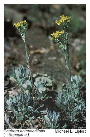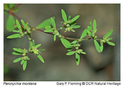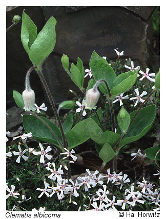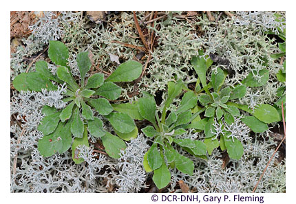 Although stunted trees of several species - e.g. , chestnut oak (Quercus montana), northern red oak (Quercus rubra), Virginia pine (Pinus virginiana) and pignut hickory (Carya glabra) - are common, shale barrens are strongly characterized by their relatively open physiognomy and by a suite of uncommon and rare plants found almost exclusively in these habitats. Endemic or near-endemic shale barren species include shale barren rock cress (Boechera serotina), white-haired leatherflower (Clematis albicoma), Millboro leatherflower (Clematis viticaulis); also endemic to Virginia), shale barren wild buckwheat (Eriogonum allenii), shale barren evening-primrose (Oenothera argillicola), shale barren ragwort (Packera antennariifolia), and Kate's Mountain clover (Trifolium virginicum). Other more or less widespread and characteristic herbaceous species of Virginia shale barrens include Pennsylvania sedge (Carex pensylvanica), little bluestem (Schizachyrium scoparium var. scoparium), poverty oatgrass (Danthonia spicata), wavy hairgrass (Avenella flexuosa), moss phlox (Phlox subulata), mountain nailwort (Paronychia montana), rock spikemoss (Bryodesma rupestre), shale barren pussytoes (Antennaria virginica), dwarf cinquefoil (Potentilla canadensis), smooth sunflower (Helianthus laevigatus), false boneset (Brickellia eupatorioides var. eupatorioides), hairy wood mint (Blephilia ciliata), and western wallflower (Erysimum capitatum var. capitatum), Bath and Alleghany Counties only).