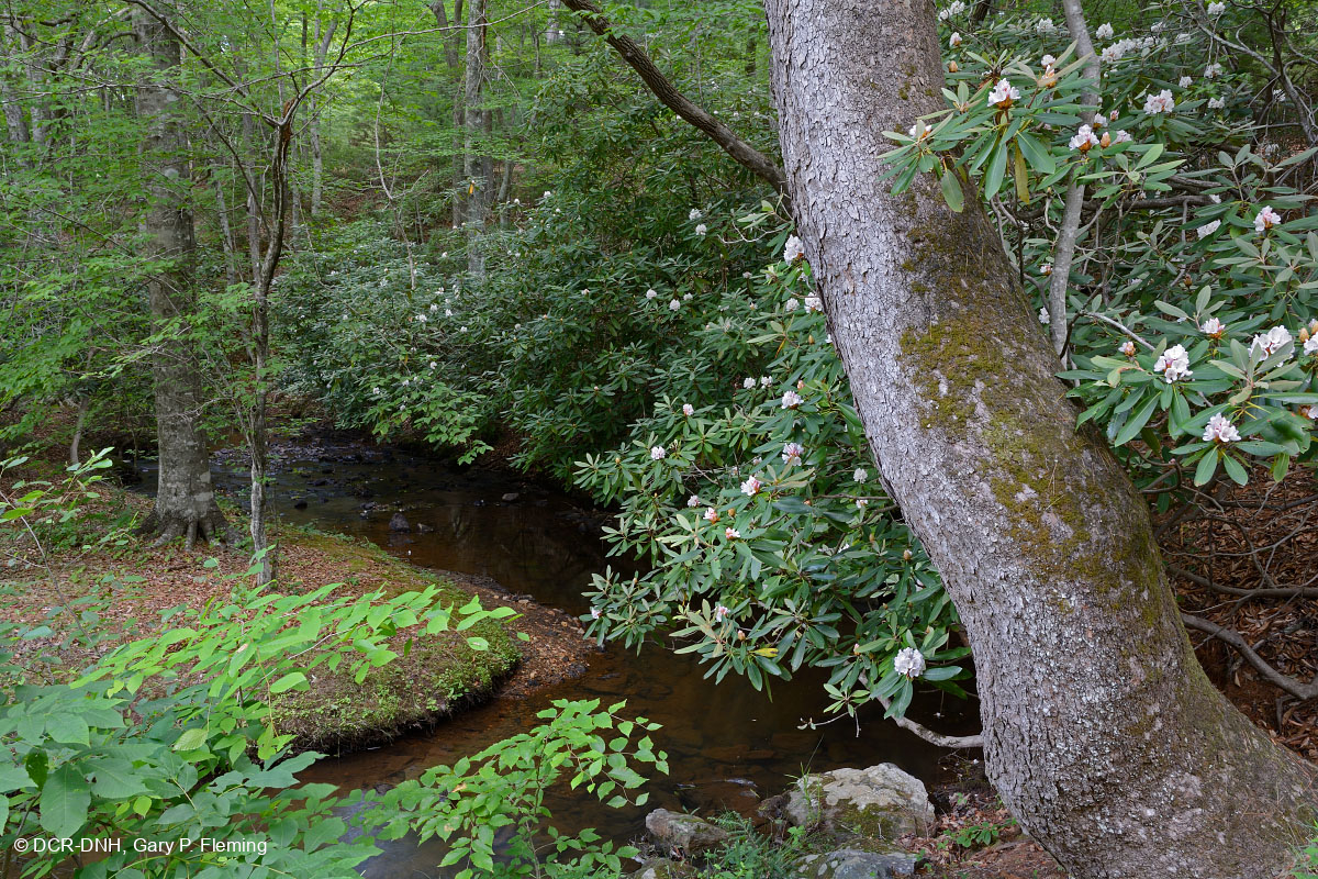 Great rhododendron (Rhododendron maximum) flowers brighten an acidic cove forest in the Southern Blue Ridge foothills of Fairystone State Park, Patrick County. © DCR-DNH, Gary P. Fleming