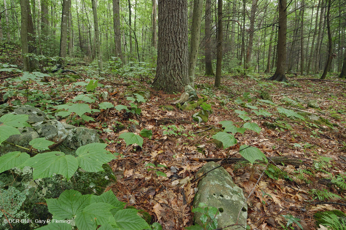 Nền rừng của một khu rừng vịnh có tính axit dọc theo Sông Bắc ở Quận Augusta bao gồm những cây giống (cây thích sọc, Acer pensylvanicum) và một số cây dương xỉ và cây thân thảo rải rác rộng rãi. Khu vực North River, Rừng quốc gia George Washington và Jefferson. © DCR-DNH, Gary P. Fleming