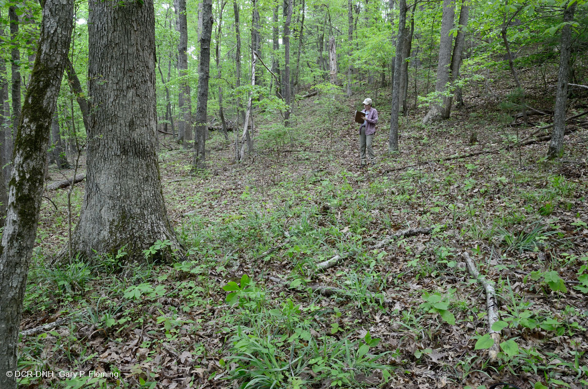 Rừng sồi-hickory có tính axit khá đa dạng và một số khu rừng có thể có số lượng loài đáng kể. Tại đây, nhà sinh thái học Karen Patterson của DCR-DNH thu thập dữ liệu từ một lô đất cố định với 90 loài. Trung tâm nghiên cứu thiên nhiên Claytor của trường Cao đẳng Lynchburg. © DCR-DNH, Gary P. Fleming