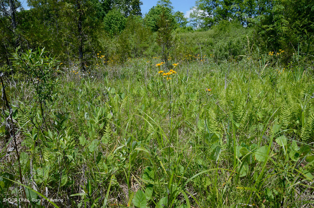 Rau vàng (Packera aurea), dương xỉ đầm lầy (T helypteris palustris var. pubescens), và cây cói trong đầm lầy đá vôi dọc theo thượng nguồn của Rattle Creek gần Greendale, Quận Washington. Khu bảo tồn Nhà nguyện Barns Bảo tồn Thiên nhiên. © DCR-DNH, Gary P.Fleming