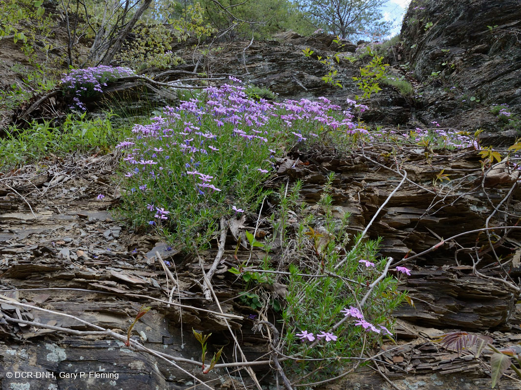 Phlox rêu (Phlox subulata) trên đá phiến Devon lộ ra trong một khu vực cằn cỗi trên Đồi Ratcliff, dọc theo sông Cowpasture gần Fort Lewis, Quận Bath. Quận North River Ranger, George Washington & Rừng Quốc gia Jefferson. © DCR-DNH, Gary P.Fleming