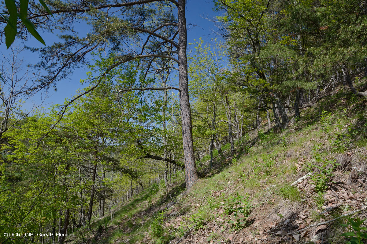 Khía cạnh mùa xuân của một vùng đá phiến rất dốc cằn cỗi với thông Virginia (Pinus virginiana), cây sồi và cây hồ đào rậm rạp, cùng hệ thực vật thảo mộc rất đa dạng. Trên sườn dốc phụ thuộc Shaws Fork ở chân phía đông của Shaws Ridge, gần Headwaters, Quận Highland. Quận kiểm lâm North River, Rừng quốc gia George Washington và Jefferson. © DCR-DNH, Gary P. Fleming