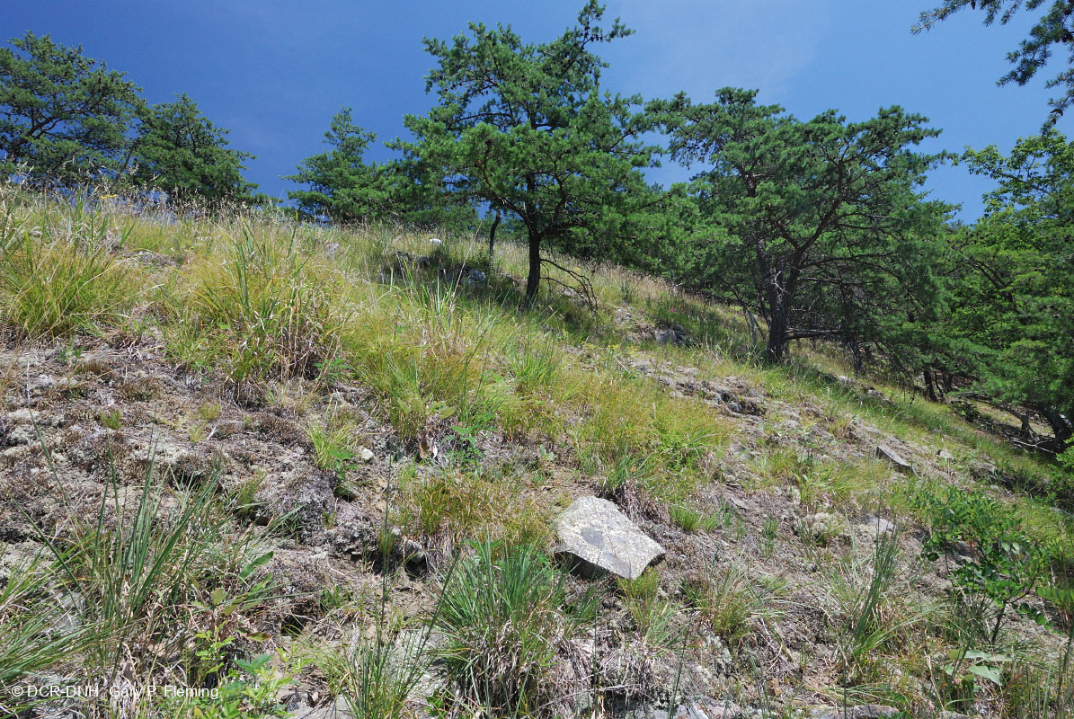Stunted Virginia pines (Pinus virginiana) and grasses (Danthonia spicata, Schizachyrium scoparium var. scoparium) in a shale ridge bald/prairie near South Sister Knob on Shenandoah Mountain, Bath County. North River Ranger District, George Washington & Jefferson National Forests. © DCR-DNH, Gary P. Fleming