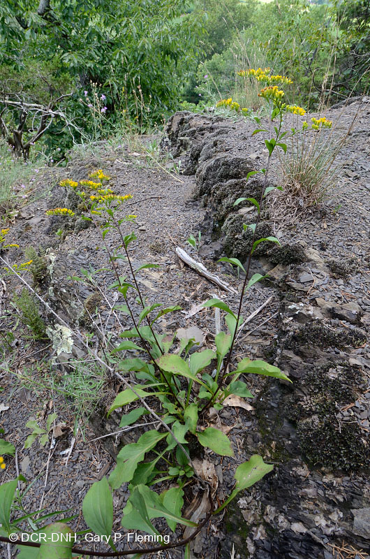 Shale barren goldenrod (Solidago harrisii) in a rocky, calcareous shale barren along the Shenandoah River North Fork near Woodstock in Shenandoah County. Ironically, despite its common name, this species has proven far more common on limestone and dolostone habitats than on shale. Seven Bends State Park. © DCR-DNH, Gary P. Fleming