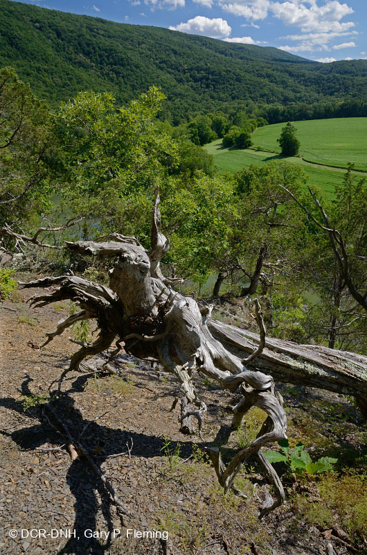 Đá phiến sét cằn cỗi với cây tuyết tùng đỏ phía đông đã chết và quang cảnh ngoạn mục của thung lũng sông North Fork Shenandoah và Núi Powell thuộc dãy núi Massanutten, phía đông nam Woodstock ở Quận Shenandoah. Công viên tiểu bang Seven Bends. © DCR-DNH, Gary P. Fleming