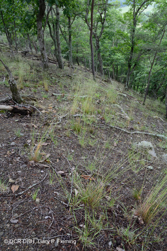 Wavy hairgrass (Avenella flexuosa) is a characteristic grass in the Northern Type of Central Appalachian shale barren. Here, it grows in a barren subtending the South Fork Shenandoah River near Bentonville, Warren County. Shenandoah River State Park. © DCR-DNH, Gary P. Fleming