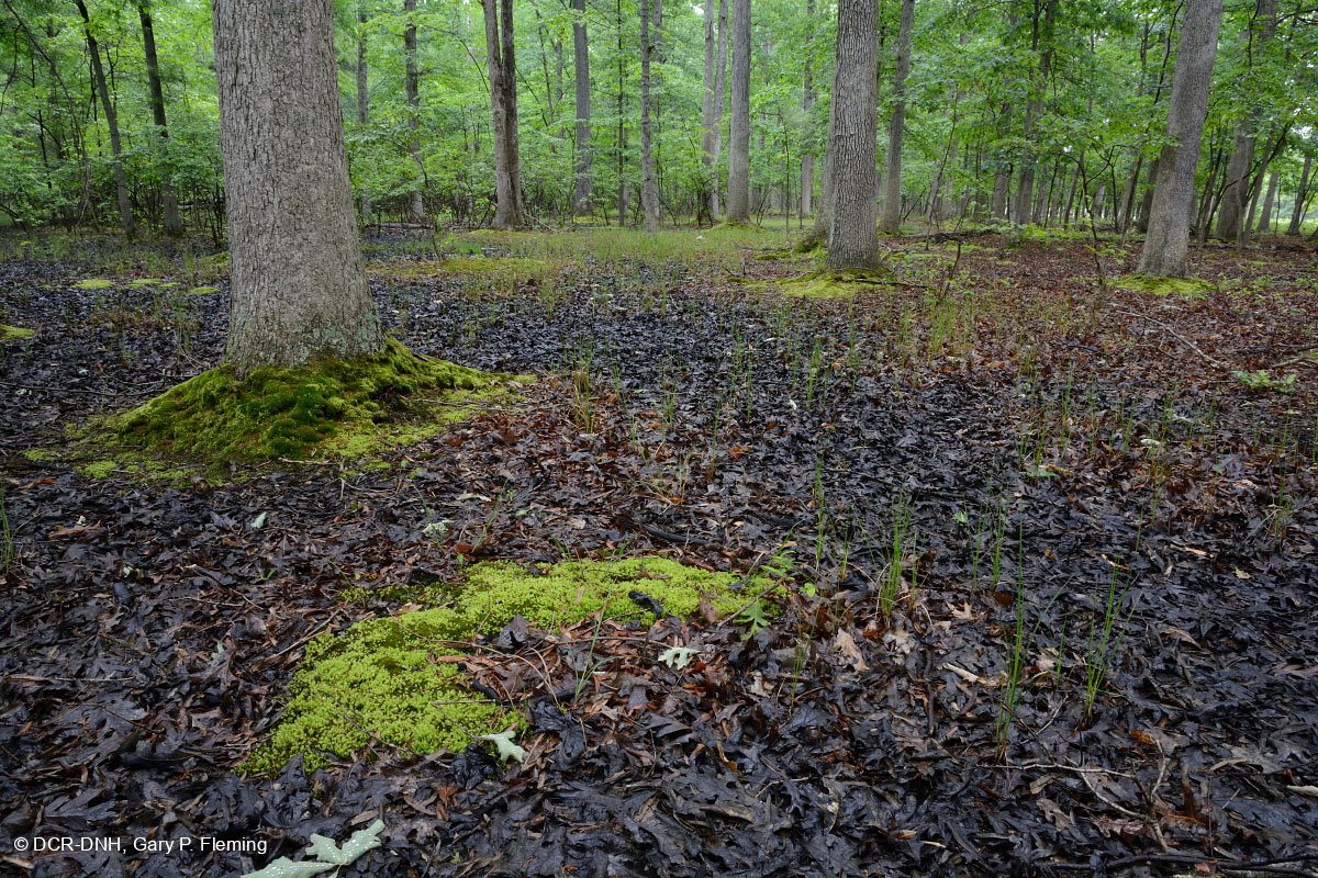 Cây sồi liễu (Quercus phellos) và các bản sao rải rác của cây cói nhung (Carex vestita) trong vùng trũng bão hòa ở rừng bằng tại Công viên Huntley Meadows, phía đông nam Quận Fairfax. Các quần thể ở đây bao gồm một quần thể các thung lũng quanh co và các chỗ trũng xuyên qua các cánh rừng bằng phẳng, và tạo nên một trong những quần thể lớn nhất thuộc loại này trong tiểu bang. © DCR-DNH, Gary P. Fleming