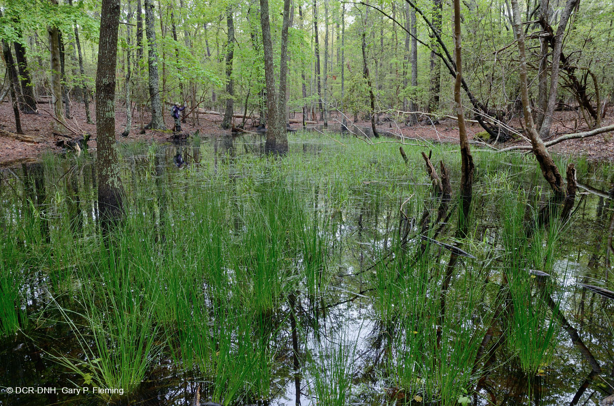 Một cái ao nhỏ bị ngập nước theo mùa trong rừng phẳng gần đầu nguồn của Mattawoman Creek, phía đông nam của Reedtown ở Hạt Northampton trên Bờ Đông. Trong giai đoạn mùa xuân này, các nhánh mọc lên của loài chim bìm bịp thông thường (Juncus effusus ssp. solutus) và cá đuối đông (Glyceria septentrion alis) mọc dưới những cây nhỏ của cây tupelo đầm lầy(Nyssa biflora). © DCR-DNH, Gary P.Fleming