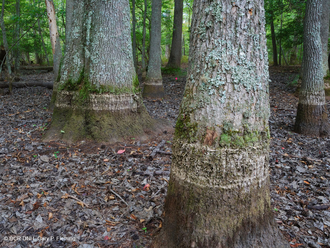 Dấu nước trên cây bụi đầm lầy (Nyssa biflora) trong một ao theo mùa cạn nước cho thấy phạm vi ngập lụt tối đa điển hình tại vùng đất ngập nước này. Khu bảo tồn thiên nhiên tiểu bang Grafton Ponds, Quận York. © DCR-DNH, Gary P. Fleming