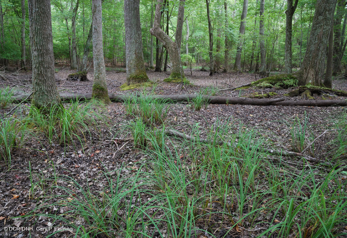 Cây bách - cói đầm lầy (Carex joorii) là loại thảo mộc phong phú nhất trong các ao theo mùa của Đồng bằng ven biển của khu phức hợp Grafton Ponds ở Quận York. Bất động sản của Thành phố Newport News. © DCR-DNH, Gary P.Fleming