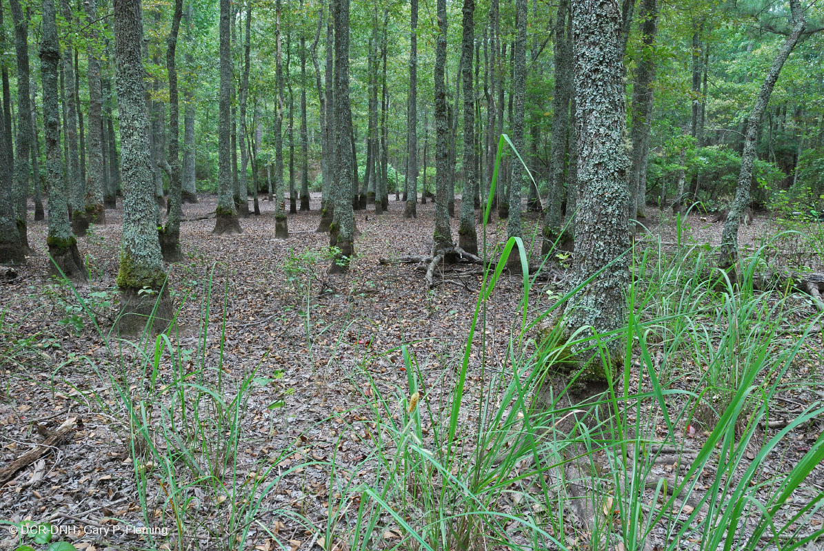 Một ao nước theo mùa cạn với cây tupelo đầm lầy có tuổi đời bằng nhau (Nyssa biflora) và những mảng cỏ lông chim mảnh (Erianthus strictus). Dấu nước trên cây cho biết mực nước cao bình thường trong ao. Khu bảo tồn Piney Grove của Tổ chức Bảo tồn Thiên nhiên. © DCR-DNH, Gary P. Fleming