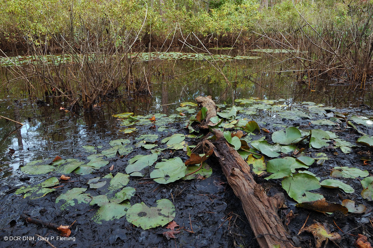 Bến đầm lầy thường (Nuphar advena), cây cúc (Cephalanthus occidentalis, ở hậu cảnh), và cá đầm lầy (Decodon verticillatus, với thân cây chết) trong một cái ao theo mùa giữa các cồn cát rừng cổ xưa tại Công viên Bang First Landing, Thành phố Virginia Beach. © DCR-DNH, Gary P.Fleming