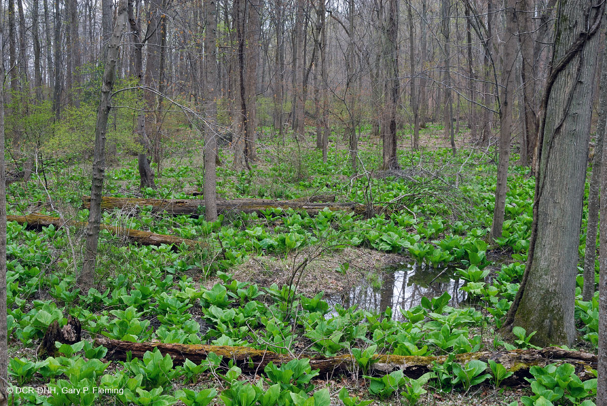 Cảnh tượng đầu xuân của một đầm lầy rò rỉ lớn trên thềm đá dọc theo Sông Potomac tại Công viên Great Falls ở Quận Fairfax. Hầu hết các đầm lầy rò rỉ trên đá biến chất của Piedmont đều có đất và nước ngầm ở trạng thái trung gian giữa đầm lầy có tính axit cao và đầm lầy có nhiều đá vôi ở Đồng bằng ven biển. Do đó, hệ thực vật của chúng chủ yếu bao gồm các loài sống ở vùng đất ngập nước và thiếu hầu hết các loài ưa canxi và kỵ canxi. © DCR-DNH, Gary P. Fleming