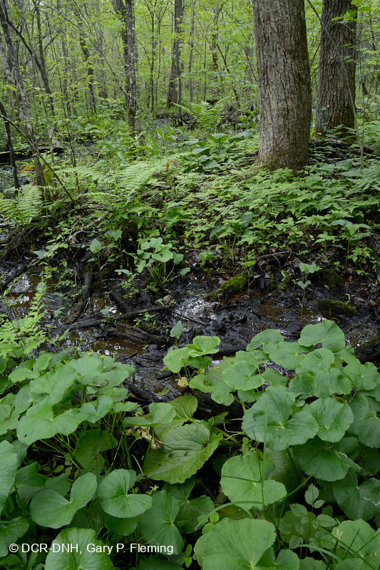 Cúc vạn thọ đầm lầy (Caltha palustris var. palustris, ở phía trước) là một loài cây mọc tách biệt trên núi khác bị giới hạn ở Đồng bằng ven biển do có nhiều đá vôi thấm vào. Khu bảo tồn thiên nhiên tiểu bang Hickory Hollow gần Tòa án Lancaster, Quận Lancaster. © DCR-DNH, Gary P. Fleming
