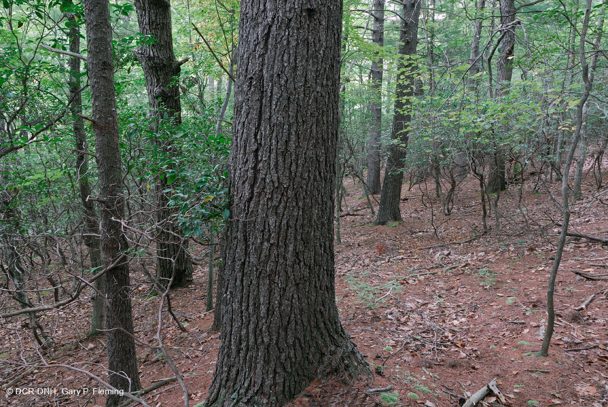 Dry forests of eastern white pine (Pinus strobus), oaks, and ericaceous shrubs such as mountain-laurel (Kalmia latifolia) are common on the low-elevation shale knobs of the west-central Virginia Ridge and Valley province. These communities are also replacing oak/heath forests throughout the Virginia mountains as white pine invades stands that have been fire-suppressed for many decades. This stand is at the south end of Tower Hill Mountain above Dry Run, Bath County. Warm Springs Ranger District, George Washington & Jefferson National Forests. © DCR-DNH, Gary P. Fleming