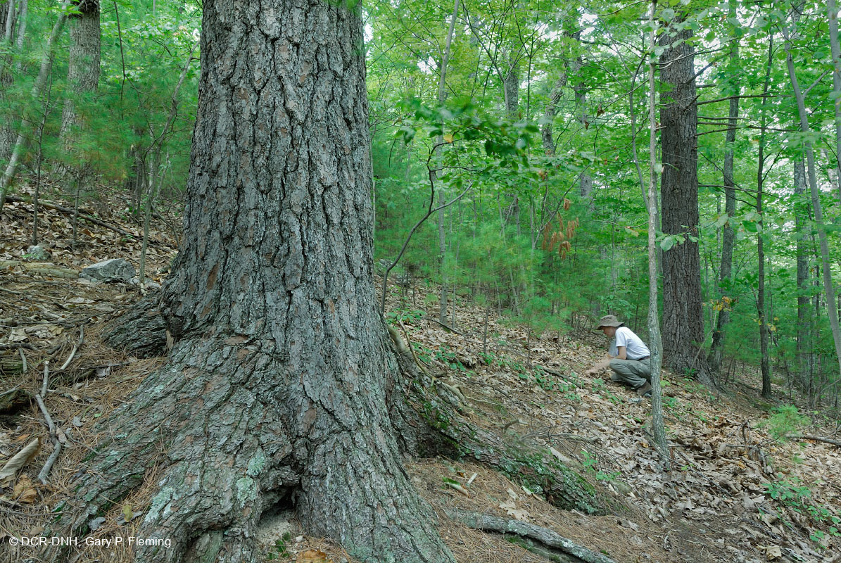 Rừng thông trắng trưởng thành (Pinus strobus) và sồi hạt dẻ (Quercus montana) với tuyển dụng cây thông trắng dày đặc. Dragon's Tooth nhọn của Núi Cove phía tây Catawba, Quận Roanoke. Quận Eastern Divide Ranger, George Washington & Rừng Quốc gia Jefferson. © DCR-DNH, Gary P.Fleming
