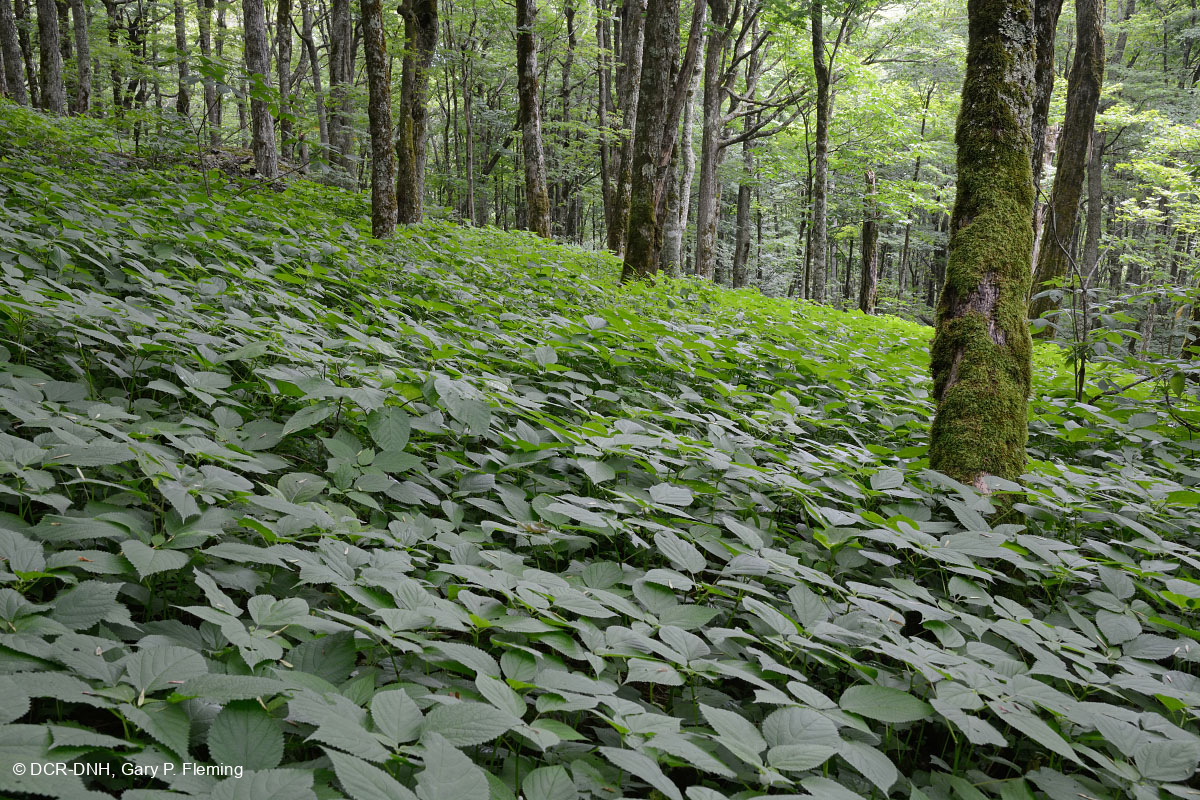 Cây tầm ma (Laportea canadensis) bao phủ sàn của một khu rừng vịnh giàu có ở độ cao lớn trên sườn đông nam của Núi Haw Orchard ở Quận Grayson. Công viên tiểu bang Grayson Highlands. © DCR-DNH, Gary P. Fleming