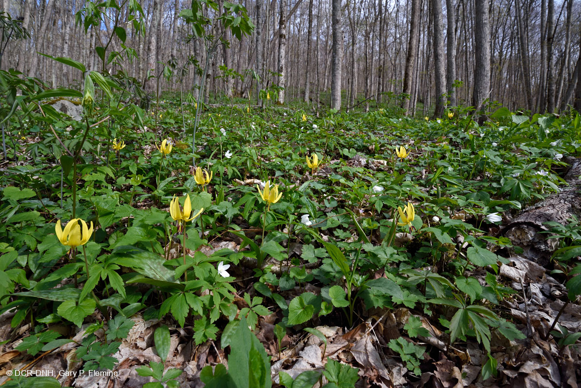 Những quần thể dày đặc của hoa loa kèn vàng (Erythronium americanum ssp. americanum) và hải quỳ gỗ (Anemone quinquefolia var. quinquefolia) làm sáng bừng sàn của một khu rừng vịnh giàu có ở độ cao dọc theo Dave's Branch, trên Elk Garden Ridge ở Dãy núi Balsam (Quận Smyth). Khu giải trí quốc gia Mount Rogers, Rừng quốc gia George Washington và Jefferson. © DCR-DNH, Gary P. Fleming