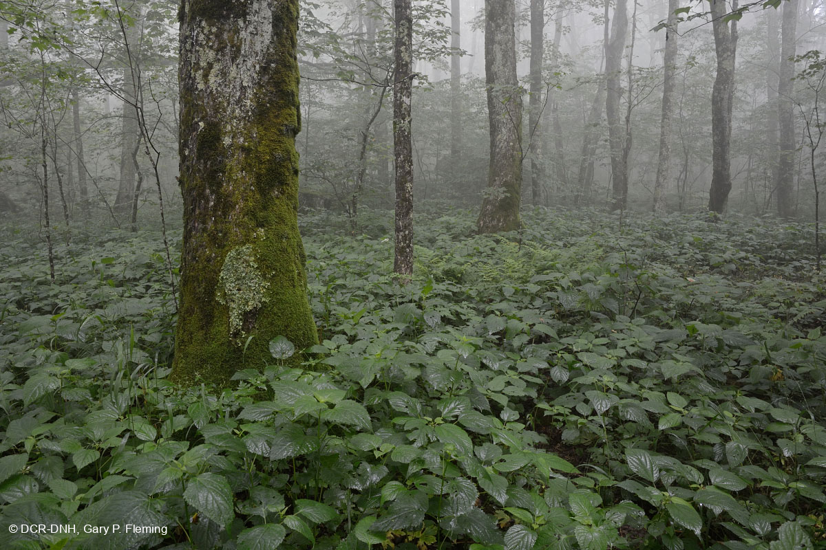 Một khu rừng rậm rạp với cây thích đường cổ thụ (Acer saccharum) và cây tầm ma (Laportea canadensis) ở phía Nam Blue Ridge. Dãy núi Balsam, nằm giữa Elk Garden Ridge và Whitetop Mountain gần Elk Garden, Quận Smyth. Khu giải trí quốc gia Núi Rogers, Rừng quốc gia George Washington và Jefferson. © DCR-DNH, Gary P. Fleming