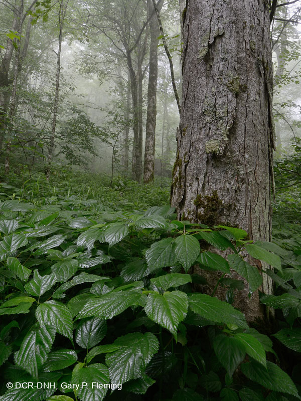 Một cây dẻ ngựa vàng già (Aesculus flava) và cây tầm ma (Laportea canadensis) trong một khu rừng vịnh giàu có ở độ cao lớn trên sườn phía đông của Núi Whitetop, Dãy núi Balsam, Quận Grayson. Khu giải trí quốc gia Mount Rogers, Rừng quốc gia George Washington và Jefferson. © DCR-DNH, Gary P. Fleming