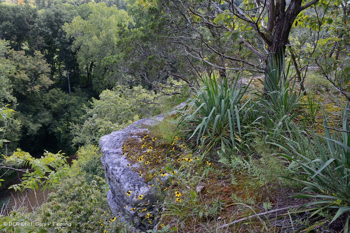 Cây thùa lá yếu (Yucca flaccida), cây cúc thơm (Symphyotrichum oblongifolium) và cây cúc nón ba thùy (Rudbeckia triloba var. triloba) dưới cây tuyết tùng đỏ phía đông (Juniperus virginiana) trong rừng đá vôi trên đỉnh vách đá dọc theo Sông Powell ở The Cedars of Lee County. Khu bảo tồn thiên nhiên Beech Grove Cliff. © DCR-DNH, Gary P. Fleming