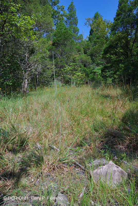 Cỏ thảo nguyên mùa ấm (Sch izachyrium scoparium var. scoparium, Bouteloua curtipendula, Andropogon gerardii) thống trị một bãi đá vôi cằn cỗi gần Dry Creek và Kin zer Hollow ở Quận Lee. Khu bảo tồn Khu vực Tự nhiên Bang Cedars. © DCR-DNH, Gary P.Fleming