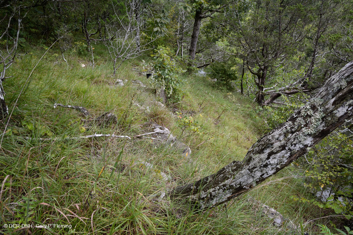 Cằn cỗi nhỏ trên một sườn lồi phía trên các vách đá vôi nằm dưới sông Powell, phía tây bắc của Fletcher Ford ở Quận Lee. Cope Tract, Khu bảo tồn Khu vực Tự nhiên Bang Cedars. © DCR-DNH, Gary P.Fleming