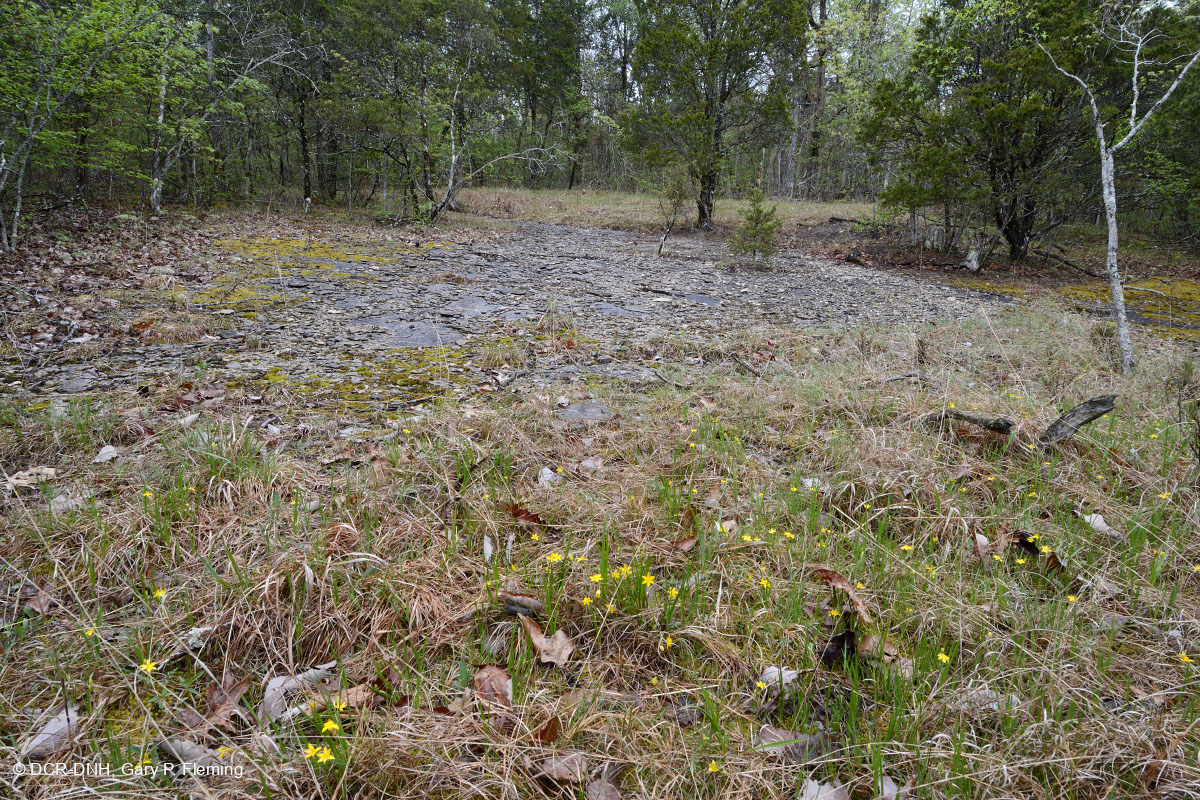 Cảnh đầu xuân của một vùng đất đá vôi cằn cỗi, với cỏ sao vàng phương Đông (Hypoxis hirsuta) nở rộ giữa những thân cỏ chết và mới mọc. Khu đất Graham, Khu bảo tồn thiên nhiên tiểu bang Cedars, Quận Lee. © DCR-DNH, Gary P. Fleming