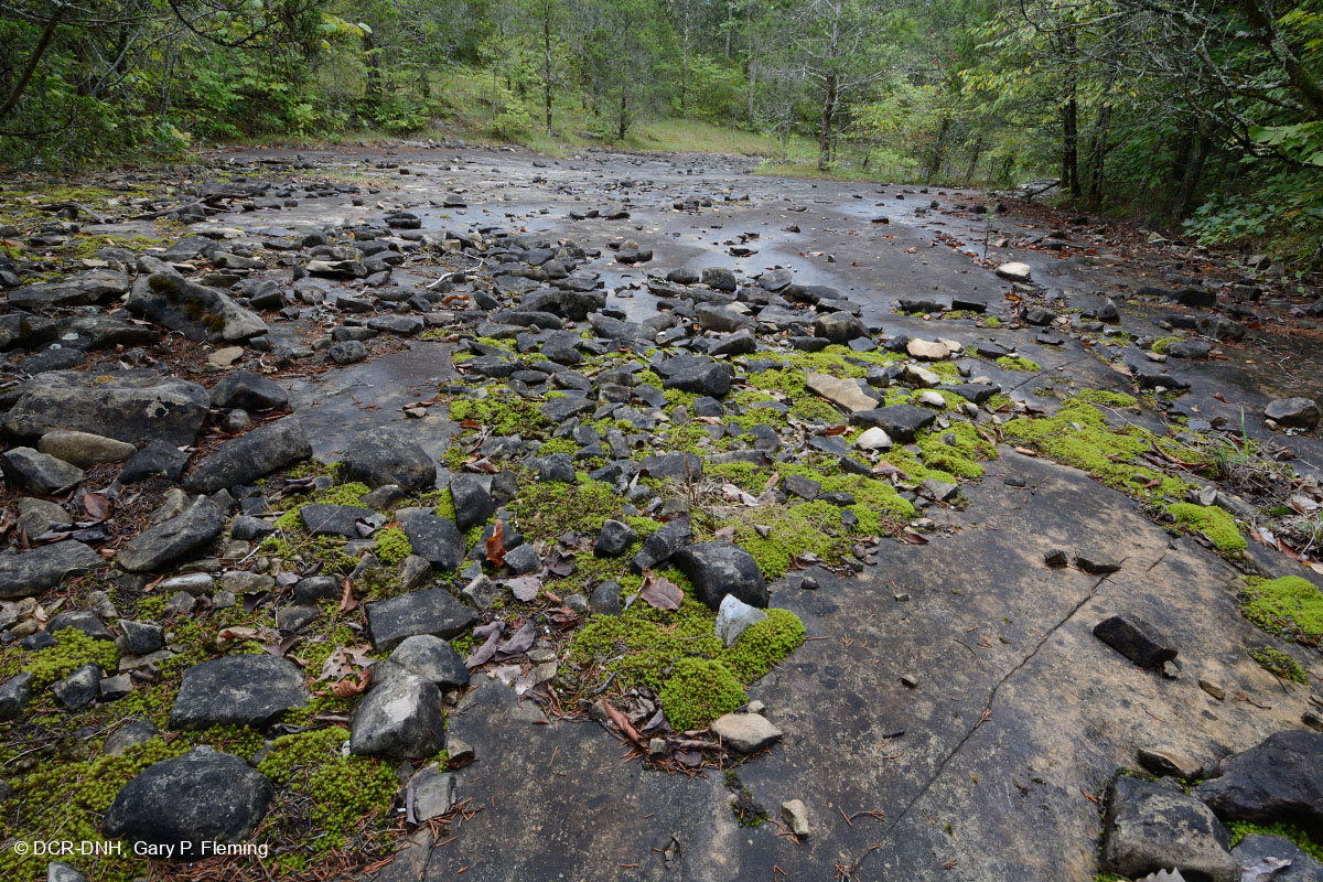 Đá vôi lộ ra trong một rãnh nhỏ cho thấy nền đá ở The Cedars nông đến mức nào. Rêu ở phía trước là Pleurochaete luteola, một loài rêu chỉ có ở vùng Trung Tây, Virginia, thuộc các quận Lee và Scott. Khu đất Graham, Khu bảo tồn thiên nhiên tiểu bang Cedars, Quận Lee. © DCR-DNH, Gary P. Fleming