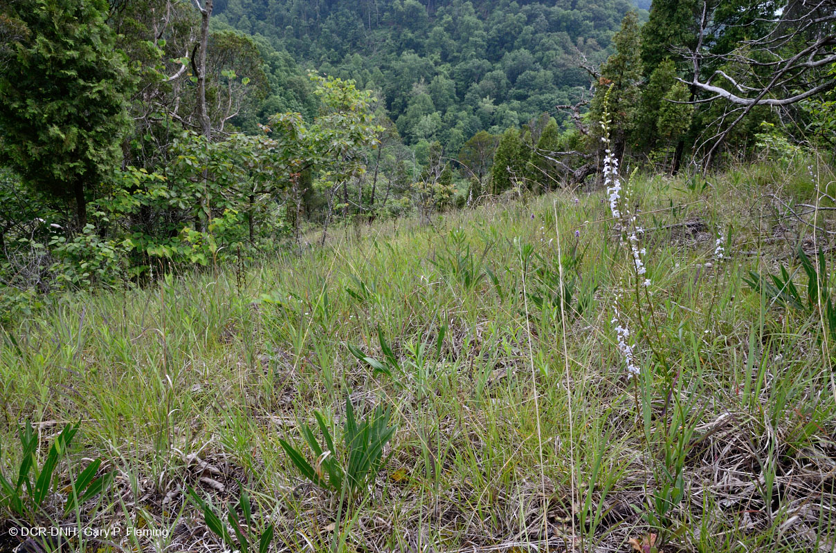 Thùy gai nhạt (Lobelia spicata var. leptostachys, ra hoa), sao băng thô (Liatris aspera, có lá rộng) và cỏ mùa ấm trong vùng đất cằn cỗi dolostone ở sườn tây nam của gò đất dọc theo Sông Clinch gần Cleveland, Quận Russell. Khu bảo tồn thiên nhiên tiểu bang Cleveland Barrens. © DCR-DNH, Gary P. Fleming