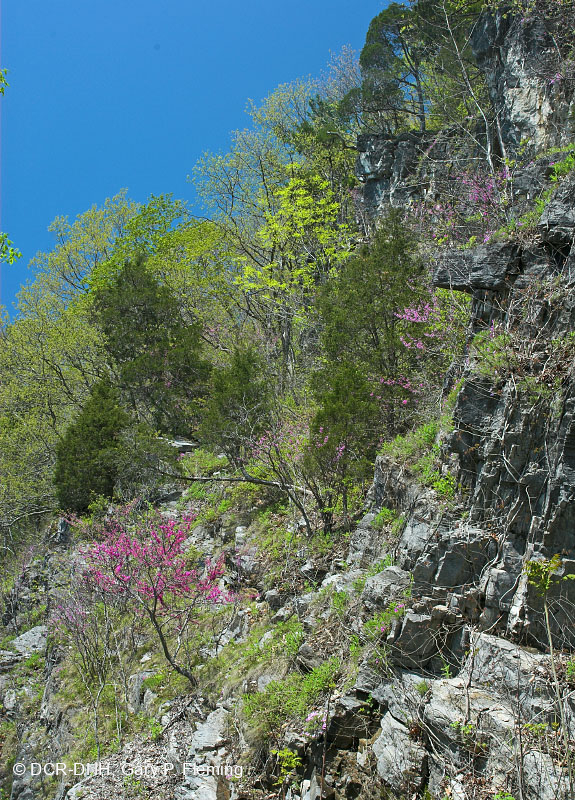 Một khu rừng rậm rạp trên vách đá dolostone râm mát dọc theo Sông New phía nam Lone Ash, Quận Wythe. Công viên tiểu bang New River Trail. © DCR-DNH, Gary P. Fleming