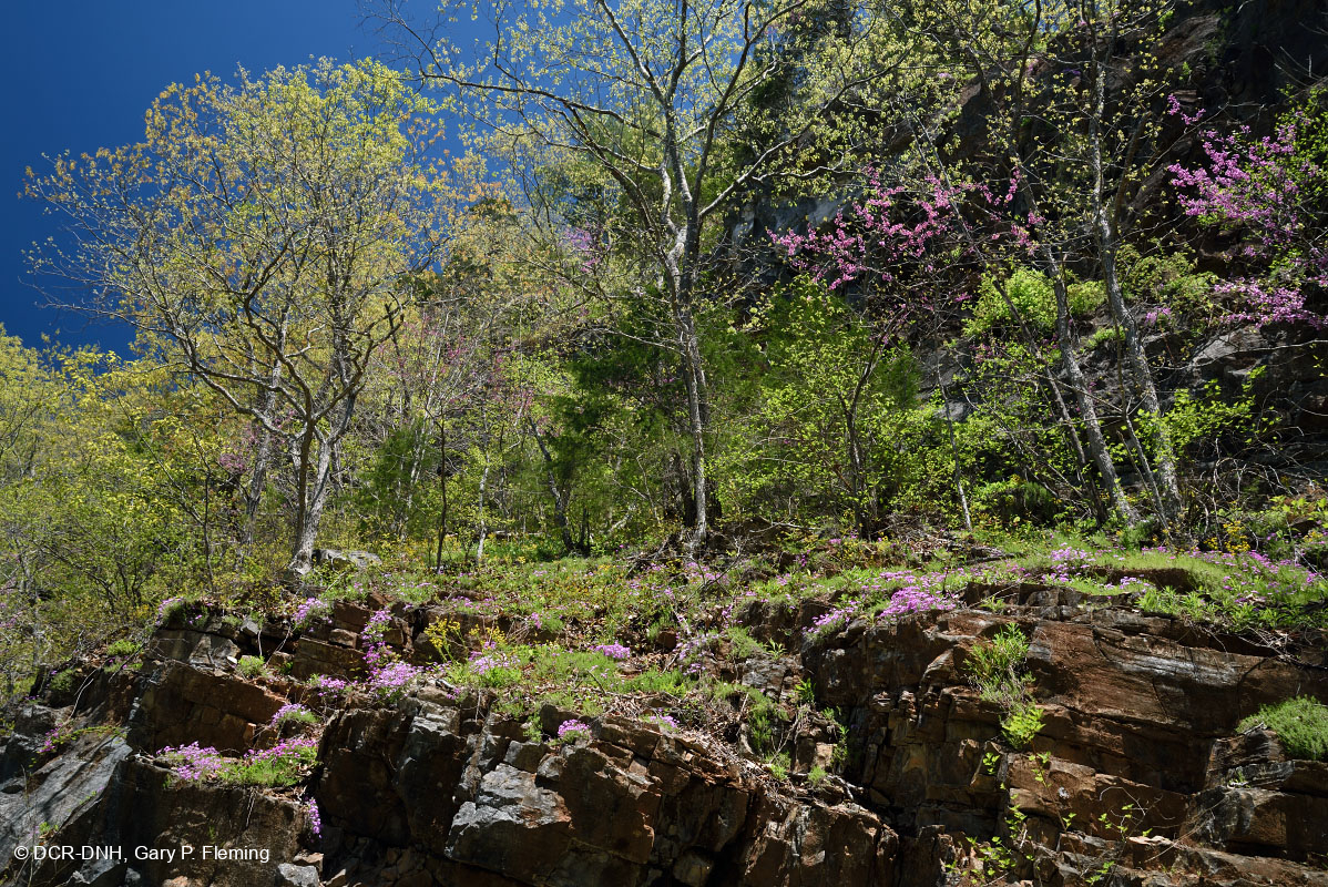 Một phần của khu rừng được hiển thị trong bức ảnh trước. Ở đây, hoa phlox rêu (Phlox subulata) và cây cói mun (Carex eburnea) tô điểm cho các gờ dưới cây sồi chinquapin (Quercus muehlenbergii), cây tuyết tùng đỏ phương đông (Juniperus virginiana) và cây redbud phương đông (Cercis canadensis var. canadensis). Công viên tiểu bang New River Trail, phía nam Lone Ash, Quận Wythe. © DCR-DNH, Gary P. Fleming