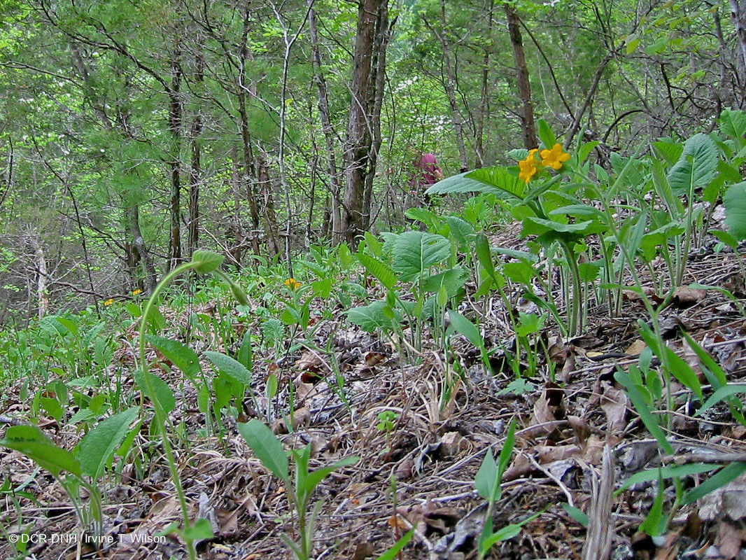 Hoa puccoon (Lithospermum canescens, có hoa) và cây quinine dại (Parthenium auriculatum, có lá rộng) trong lớp thảo mộc mùa xuân của rừng dolostone Ridge và Valley. Quinine hoang dã, cùng với hoa nón trơn (Echinacea laevigata) và cây cúc đồng cỏ (Packera paupercula var. appalachiana), là loài ưa magnesi được chẩn đoán thuộc loại cộng đồng này. Khu bảo tồn thiên nhiên tiểu bang Sweet Spring Hollow, Quận Montgomery. © DCR-DNH, Irvine T. Wilson