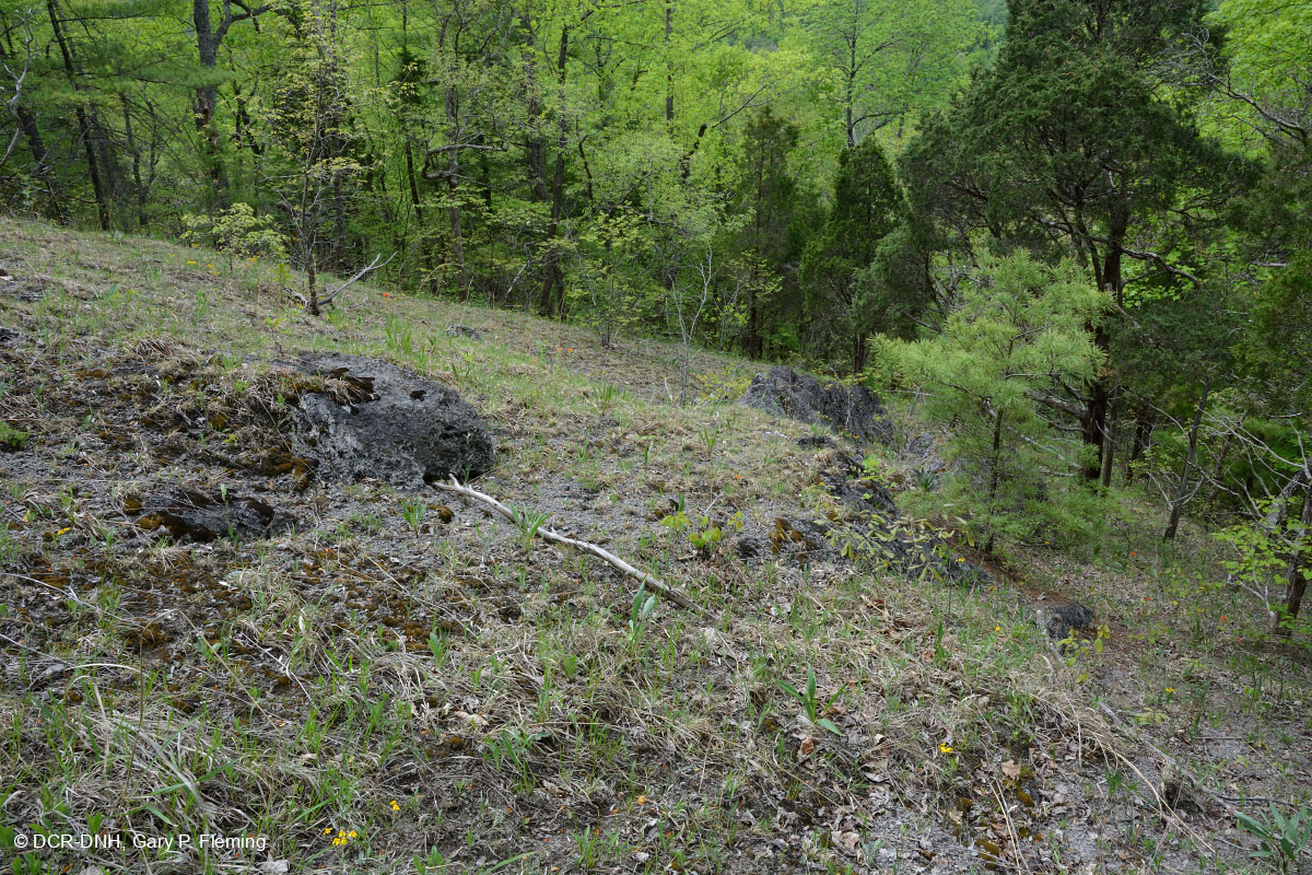 Spring aspect of a very rocky, xeric dolostone woodland opening near Coffee Valley in Montgomery County. Later in the growing season, this area supports patchy warm-season grasses and lithophytic forbs. © DCR-DNH, Gary P. Fleming