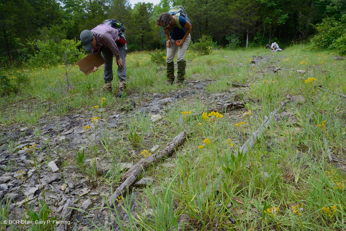 Các nhà sinh thái học DCR-DNH kiểm tra một trong những bãi đất trống bằng đá vôi gần Lexington, Quận Rockbridge. Cây cúc dại (Packera anonyma), hành tây gật đầu (Allium cernuum) và cây hạt trần (Sporobolus vaginiflorus) là những loài chiếm ưu thế trên mỏm đá này. © DCR-DNH, Gary P. Fleming