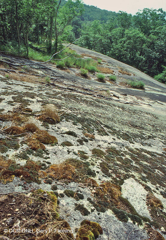 Mái vòm đá granit tẩy tế bào chết tại Striped Rock trên Point Lookout Mountain, một ngọn núi cao nhô lên phía trên cao nguyên Southern Blue Ridge ở Hạt Grayson. Sự thấm định kỳ trên bề mặt là mối tương quan quan trọng của thảm thực vật. © DCR-DNH, Gary P.Fleming