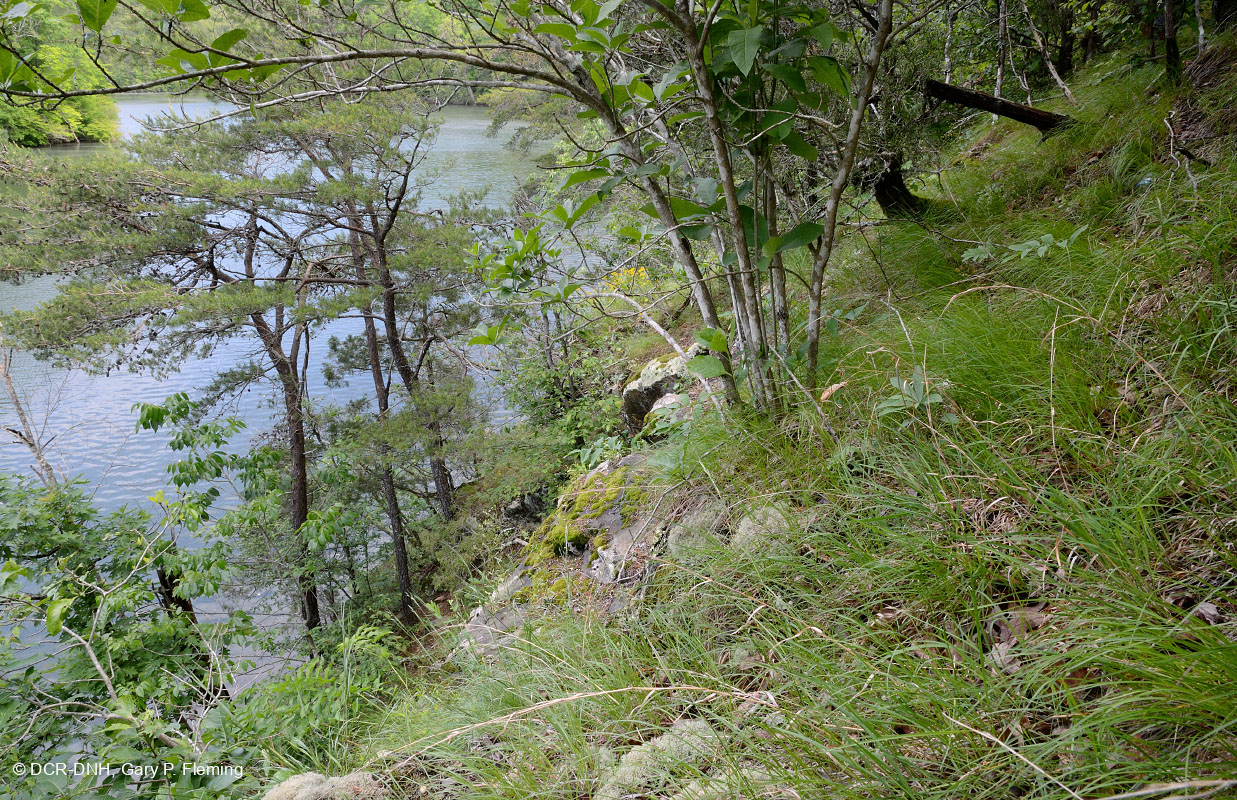 Đồng cỏ cằn cỗi, dốc đứng trên bệ đá mafic lộ thiên; trên vách đá hướng về phía tây dọc theo Sông Smith ở thượng nguồn Hồ chứa Philpott (Quận Patrick). © DCR-DNH, Gary P. Fleming
