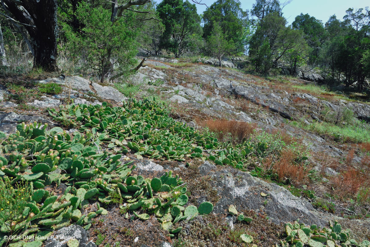Cây tuyết tùng đỏ phía đông còi cọc (Juniperus virginiana) và cây lê gai (Opuntia humifusa) là những loài thực vật nổi bật trong vùng đất mafic 8.5mẫu Anh cằn cỗi trên Bald Knob ở Quận Franklin. Khu bảo tồn thiên nhiên Bald Knob State. © DCR-DNH, Gary P. Fleming