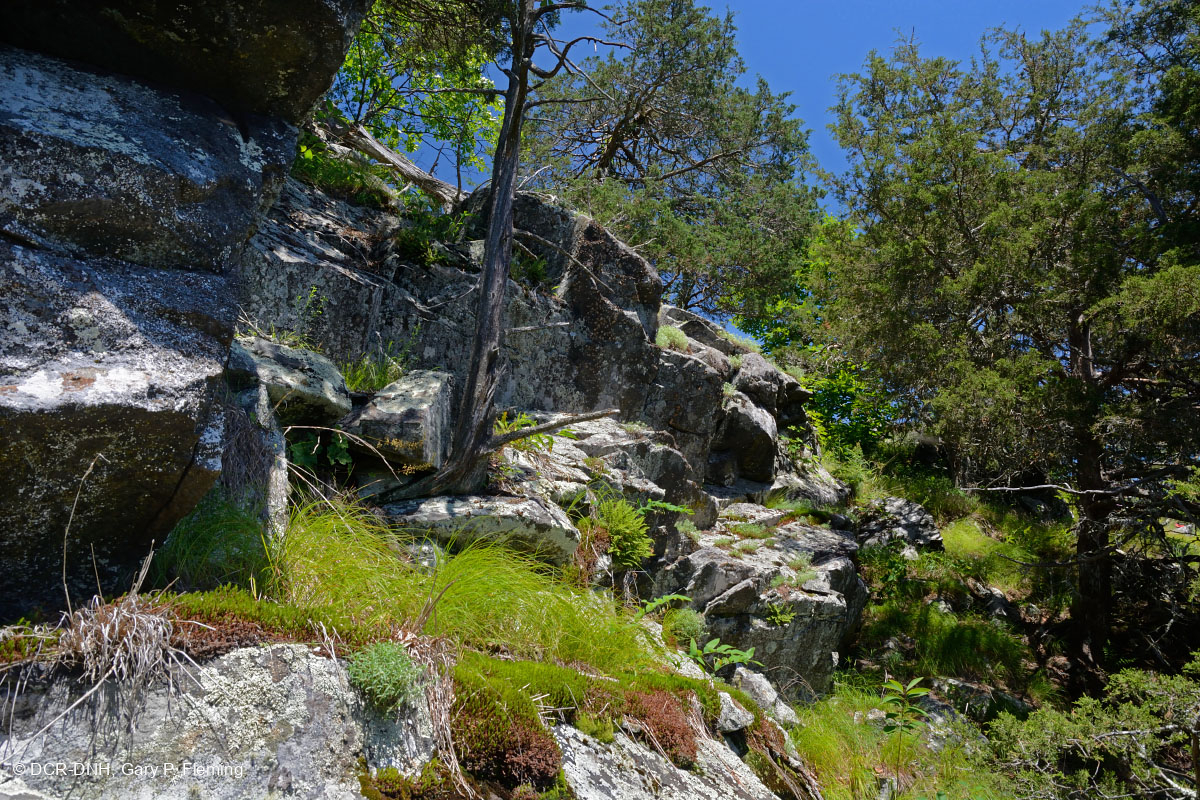 Các mỏm lõm Amphibolite, cây tuyết tùng đỏ còi cọc phía đông (Juniperus virginiana), và thảm thực vật thân thảo ở Trung Appalachian Mafic/Calcareous Barren ở sườn đông nam của Núi Sugarloaf, chân đồi Blue Ridge ở Hạt Nelson.