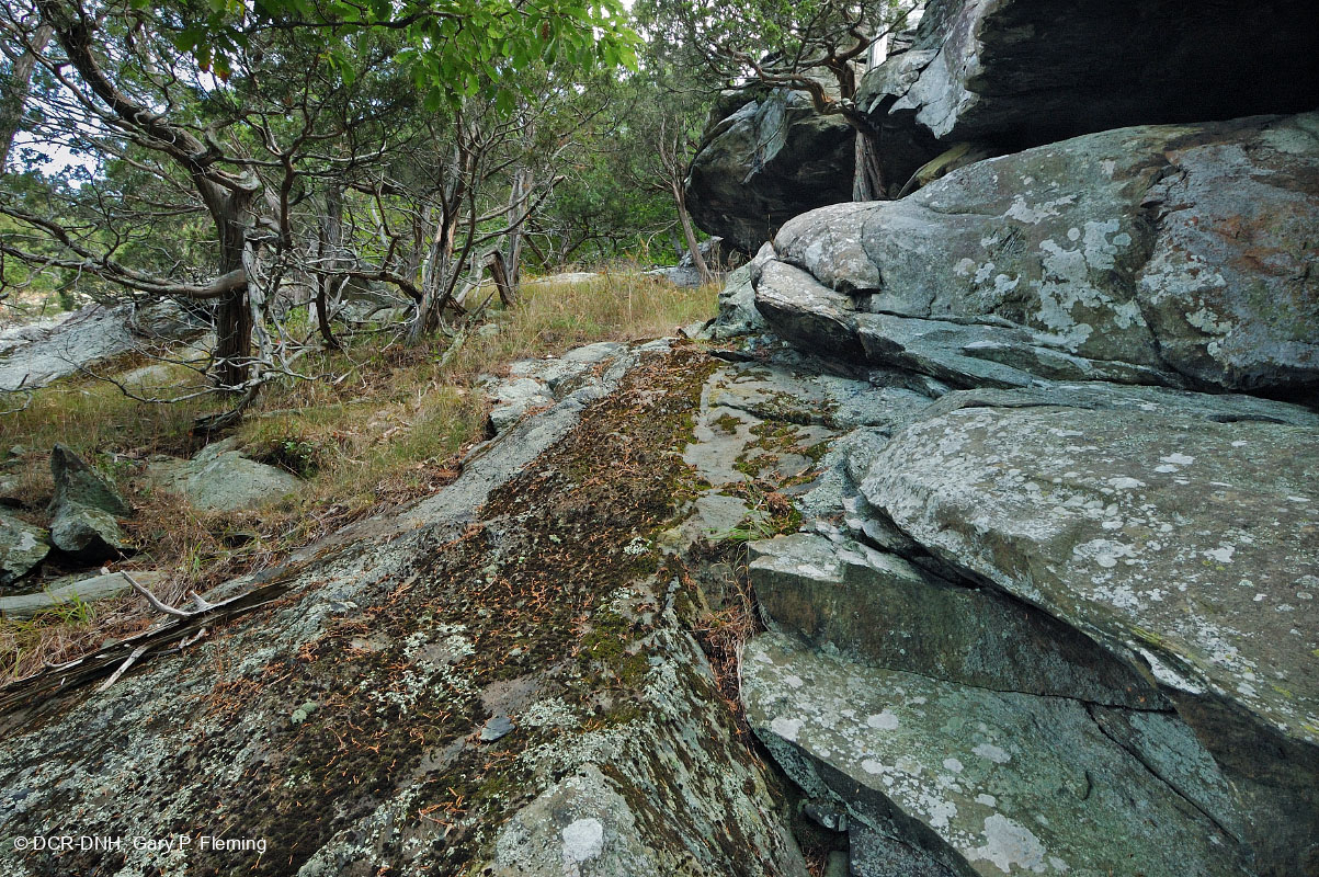 Các mỏm đá Metabasalt, cây tuyết tùng đỏ phía đông có gân xù (Juniperus virginiana), và các loại cỏ trong một mỏm đất cằn cỗi trên một con dốc quay mặt về phía tây nam dọc theo sông Rose, Quận Madison, Vườn quốc gia Shenandoah. © DCR-DNH, Gary P.Fleming