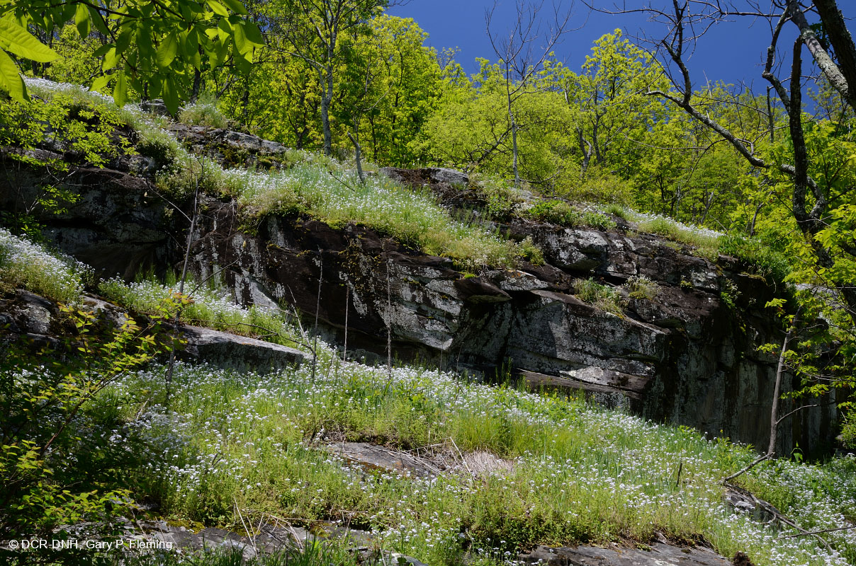 Appalachian phacelia (Phacelia dubia var. dubia) can be phenomenally abundant in the Central Appalachian Mafic / Calcareous Barren (Mid-Elevation Type) community. This annual flowers early and dies back completely by mid summer. Bucks Elbow Mountain on the Northern Blue Ridge, Albemarle County. © DCR-DNH, Gary P. Fleming