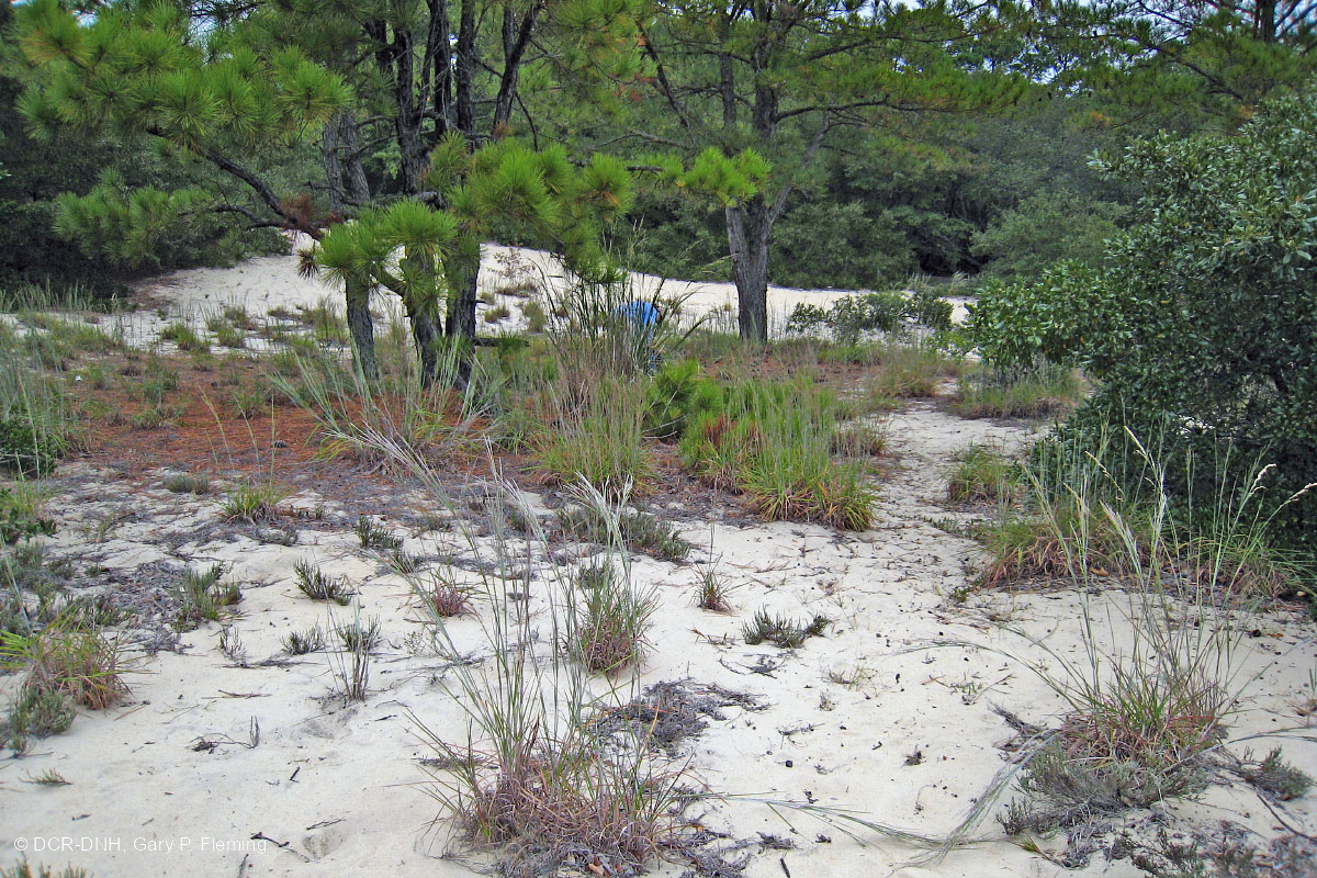 Loblolly pine/sand heather woodland on high, xeric dunes along the eastern side of First Landing State Park in City of Virginia Beach. Seaside little bluestem (Schizachyrium littorale) is a common grass in this stand. © DCR-DNH, Gary P. Fleming