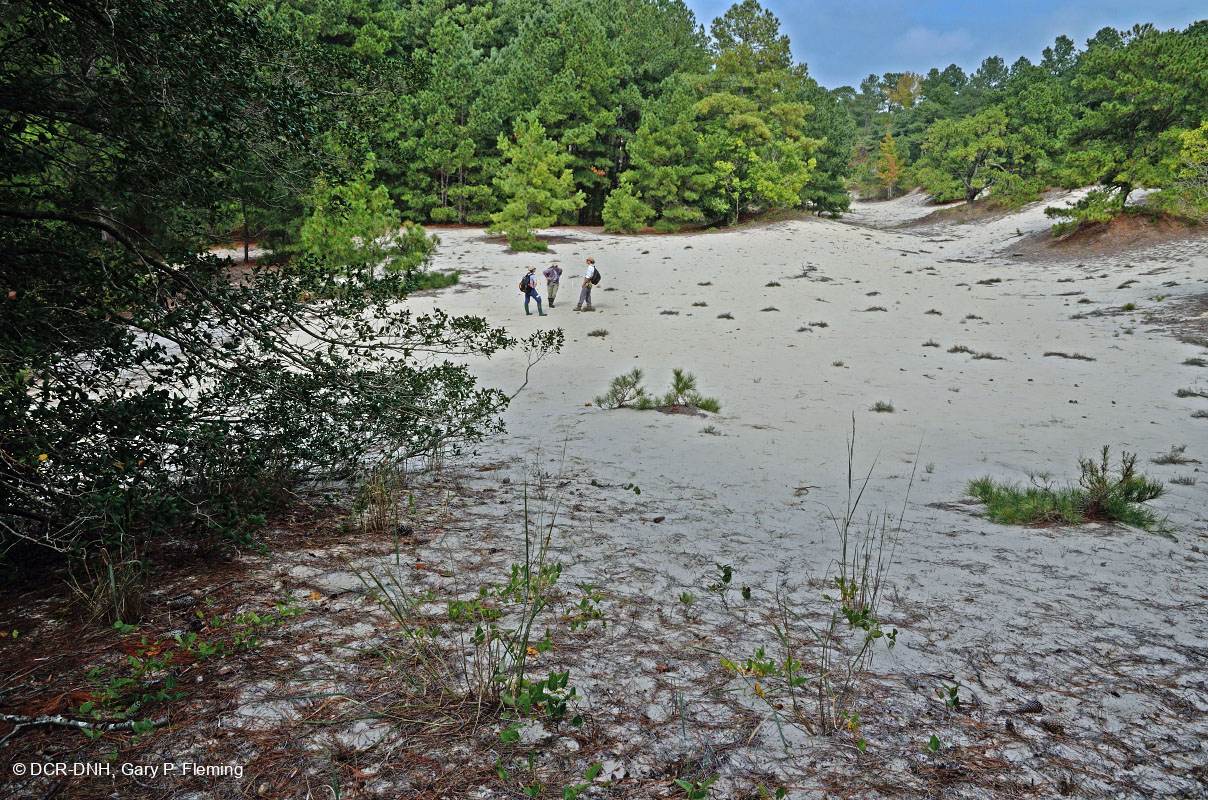 Các nhà sinh thái học DCR-DNH và quản lý khu vực trên một bãi cát lớn (có thể là một khu vực phun nước cũ) trong khu rừng cây thạch cao/thông loblolly tại Khu bảo tồn Khu tự nhiên Bang Savage Neck Dunes ở Hạt Northampton. Lưu ý những cây thông được chôn vùi chủ yếu và nhiều cụm thạch nam cát (Hudsonia tomentosa) trên mặt bằng mở. © DCR-DNH, Gary P.Fleming