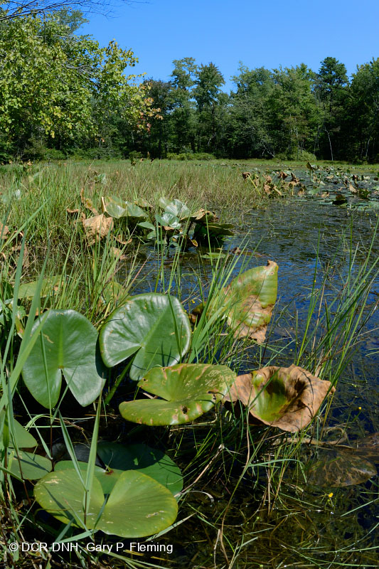Bò đục thường (Nuphar advena) và cá ngừ vảy nhọn (Glyceria acutiflora) trong ao hố sụt bị ngập bán vĩnh viễn tại Khu bảo tồn Khu tự nhiên Bang Deep Run Ponds ở Hạt Rockingham. © DCR-DNH, Gary P.Fleming
