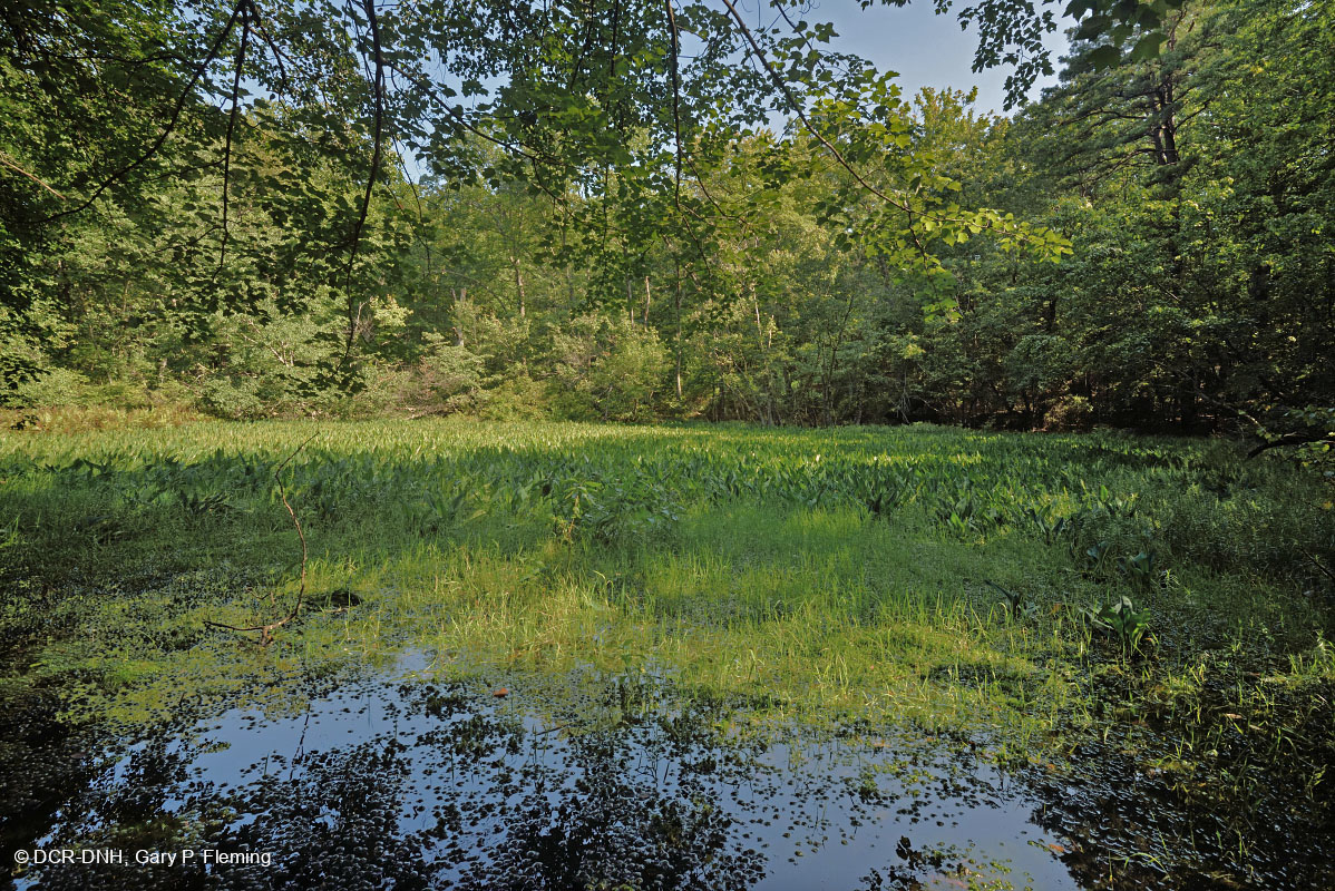 Một cái ao hố sụt nguyên sơ, bị ngập lụt bán vĩnh viễn nằm dưới chân Blue Ridge gần Harriston, Quận Augusta. Ao này có thành phần hơi khác thường, với gậy vàng (Orontium aquaticum), cói ba chiều(Dulichium arundinaceum var. arundinaceum) chiếm ưu thế trong một trung tâm mở, và các cây bụi như cây cúc (Cephalan thus occidentalis) giới hạn ở các cạnh. © DCR-DNH, Gary P.Fleming